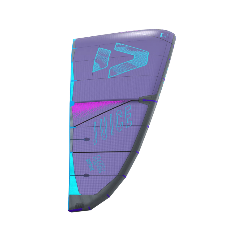 La Juice 2025 mise sur la légèreté et la réactivité avec des poches de lattes allégées pour limiter les frottements. Le sweep accru et le profil optimisé stabilisent l'aile en basse vitesse tout en maintenant une bonne tenue en traction. Ce compromis entre rigidité et poids réduit la fatigue lors des longues sessions et améliore la maniabilité à faible allure.