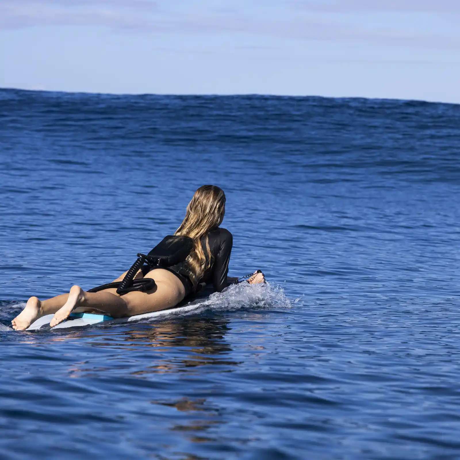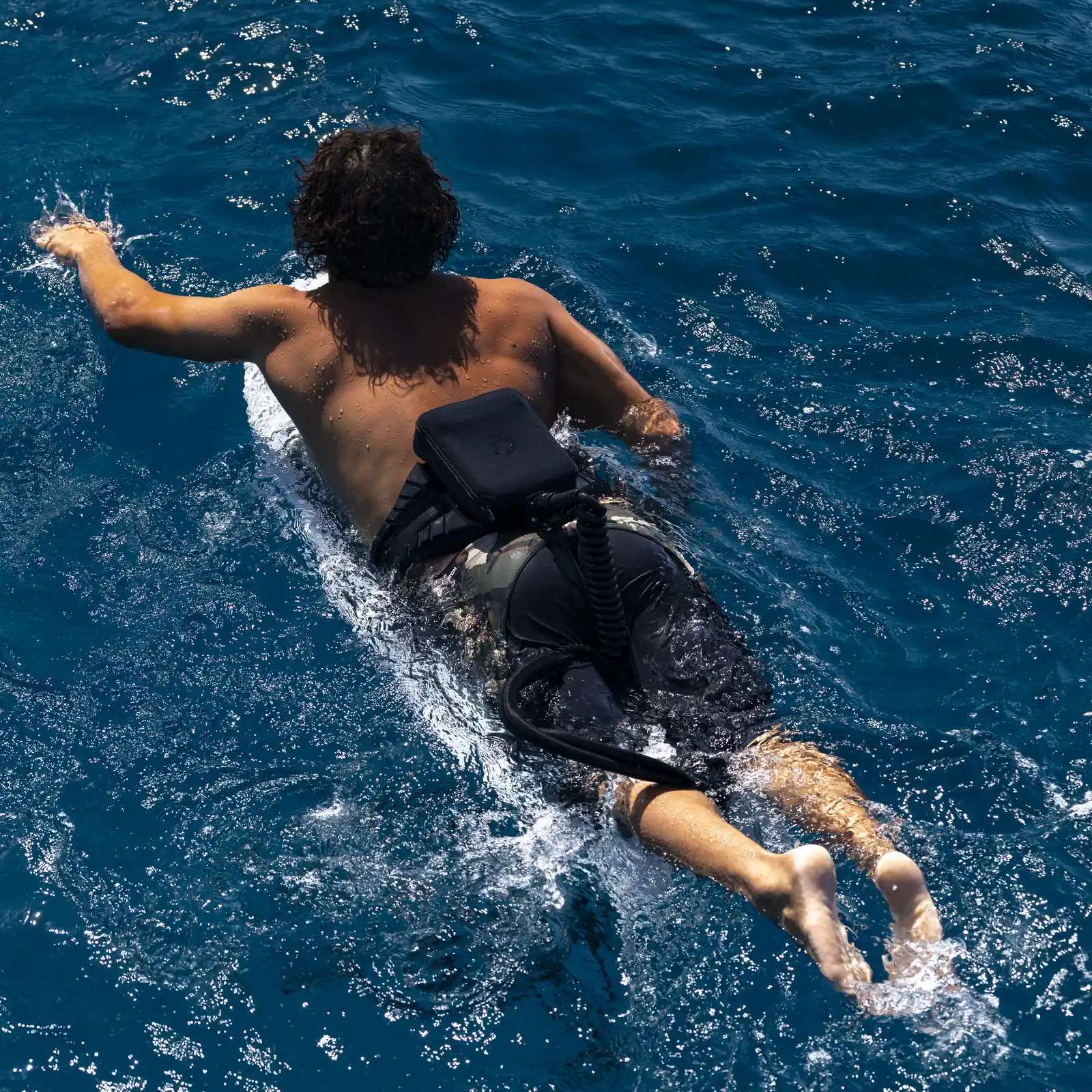 Placer les deux batteries de 1 kg autour de la taille change les sensations : la planche retrouve une tenue plus légère sous les pieds et le foil gagne en réactivité. On ressent une accélération plus directe du moteur puisqu'aucune masse n'alourdit la board, ce qui rapproche la sensation de celle d'un foil non assisté.