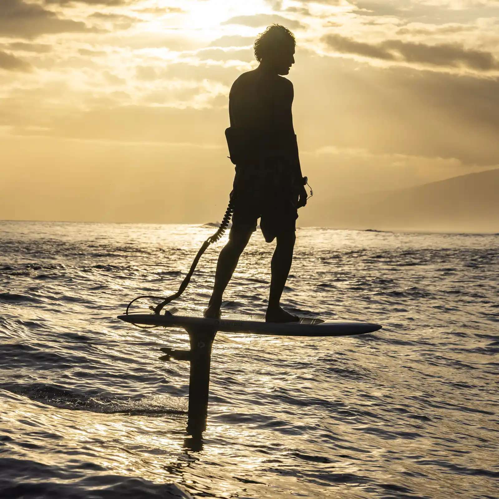 Le placement des batteries autour de la taille optimise le centre de gravité et rend la planche plus légère sous les pieds, améliorant la réactivité du foil. Le harnais offre confort, protection néoprène et détachement magnétique pour la sécurité.