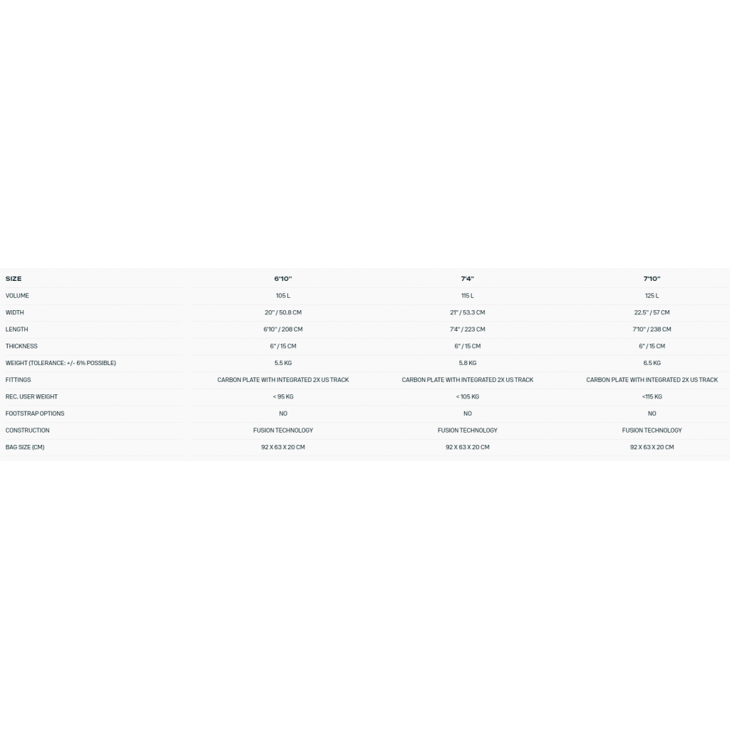| Taille ("/cm) | Volume (L) | Largeur ("/cm) | Epaisseur ("/cm) | Poids +/-6% (kg) |