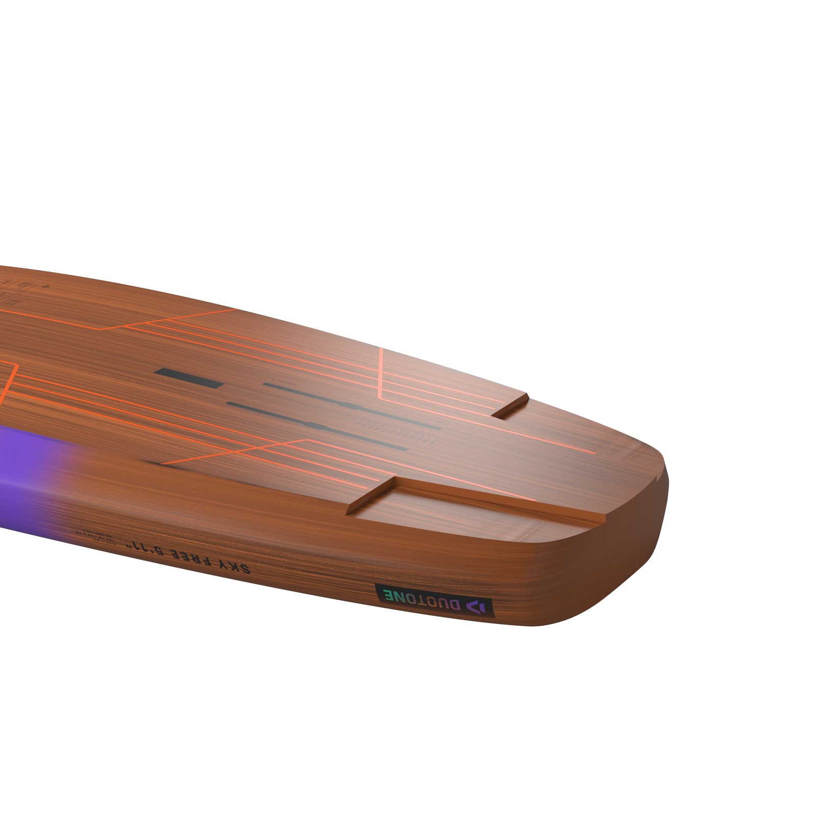 La Duotone Sky Free 2026 est une planche de wingfoil pensée pour la progression et le freeride. Son shape allongé et plus étroit optimise la glisse et les décollages. Les cut-outs arrière facilitent la libération sur le foil, et le pont creusé (recessed deck) améliore la connexion au foil. Construction Solid Vacuum Epoxy Bamboo Sandwich, légère, rigide et durable.