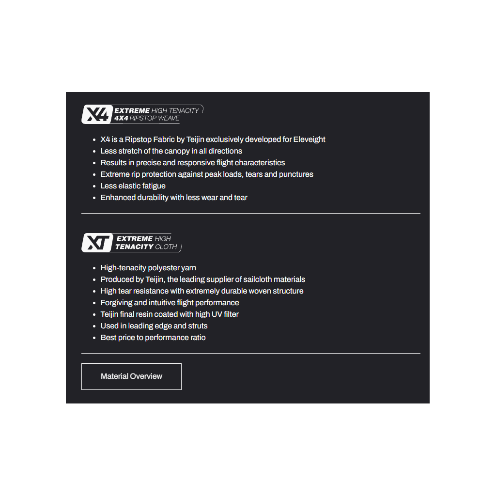 La construction de l’XS V5 s’appuie sur des matériaux haut de gamme pour garantir durabilité et performance. Le spi en Teijin X4 Ripstop combine légèreté et solidité, tandis que le bord d’attaque et les lattes renforcées supportent sans faille les contraintes liées aux sauts radicaux et aux vents puissants. Cette conception premium inspire confiance et assure une longévité accrue, permettant aux riders de profiter de leur aile intensivement saison après saison. L’accent mis sur la résistance n’enlève rien à la légèreté générale de l’aile, qui conserve une maniabilité fluide et précise même dans les conditions les plus exigeantes.