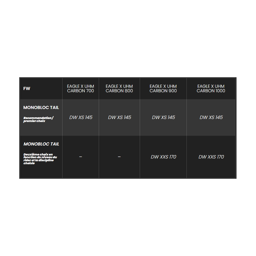 La structure utilise du carbone Ultra Haut Module (UHM) en Pre-preg pour une rigidité notable qui stabilise l'aile aux vitesses élevées. Cette association garde la nervosité et la précision des commandes, surtout quand tu charges l'appui. Le design mise sur le compromis entre légèreté et tenue pour tenir les runs rapides sans flex excessif.