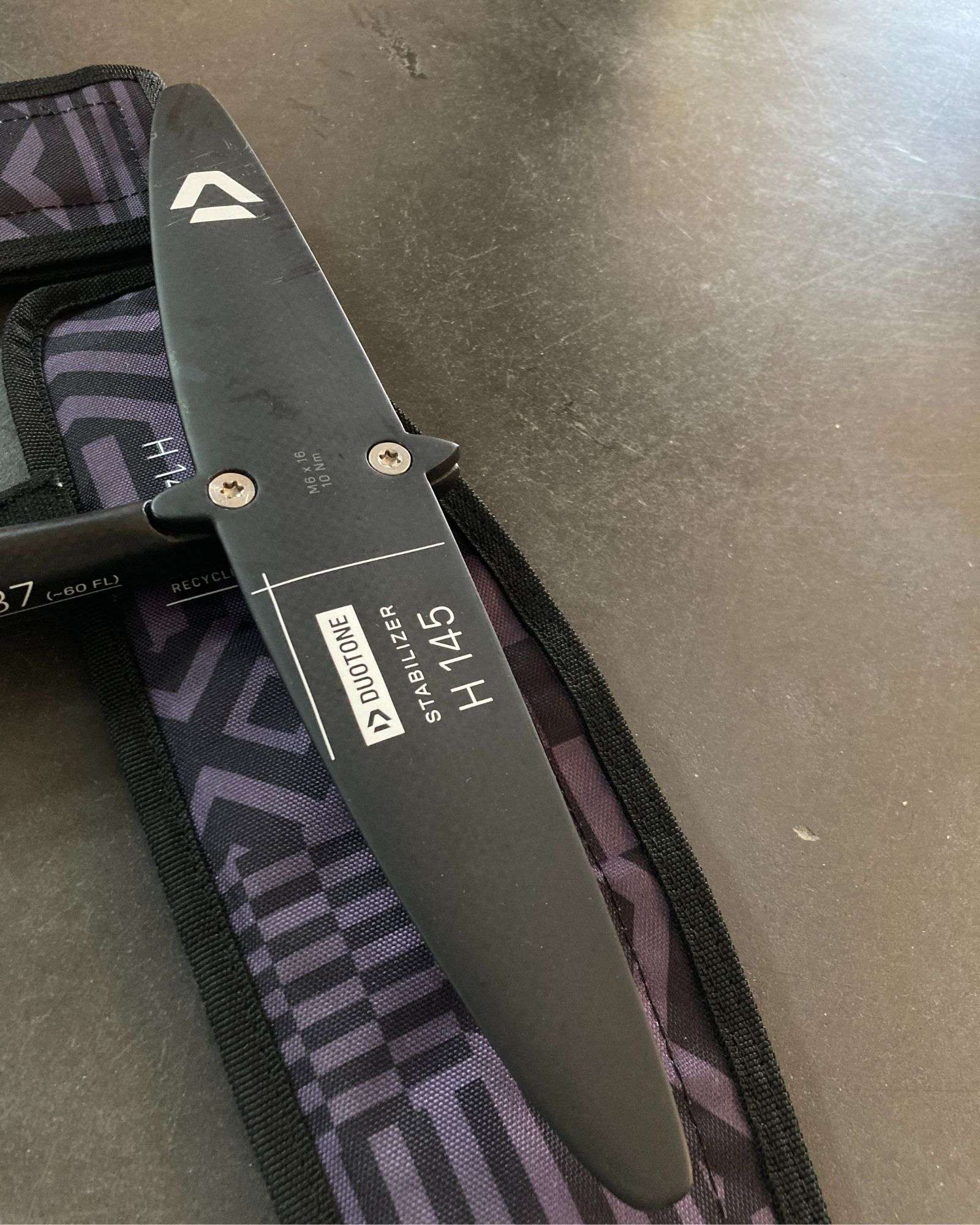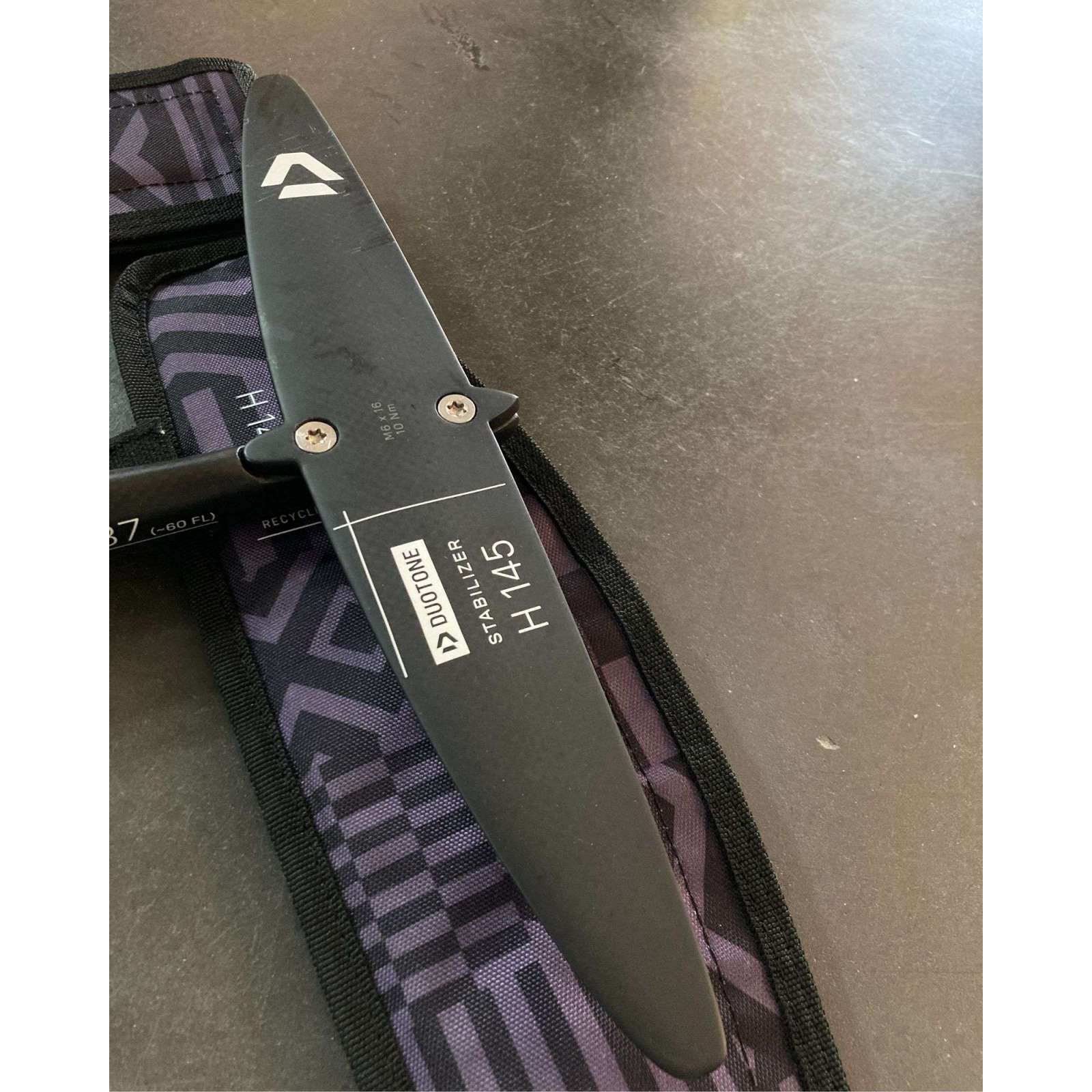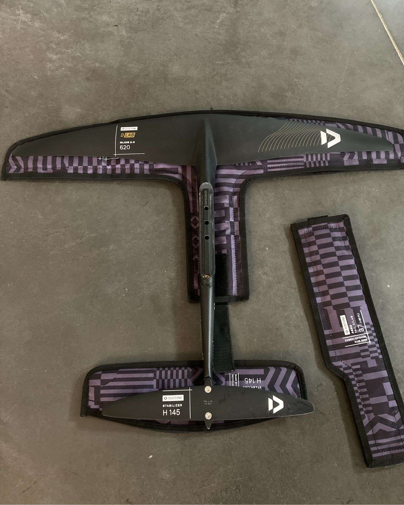 Set Duotone Glide 2.0 D/LAB 620 + stabilisateur H145 + Aerotail D/LAB 37 en bon état. Ultra léger, rigide et réactif, ce combo garantit un départ rapide, une glisse efficace et un contrôle optimal en wingfoil pour le freeride et le surf. Housses incluses, prêt à naviguer.