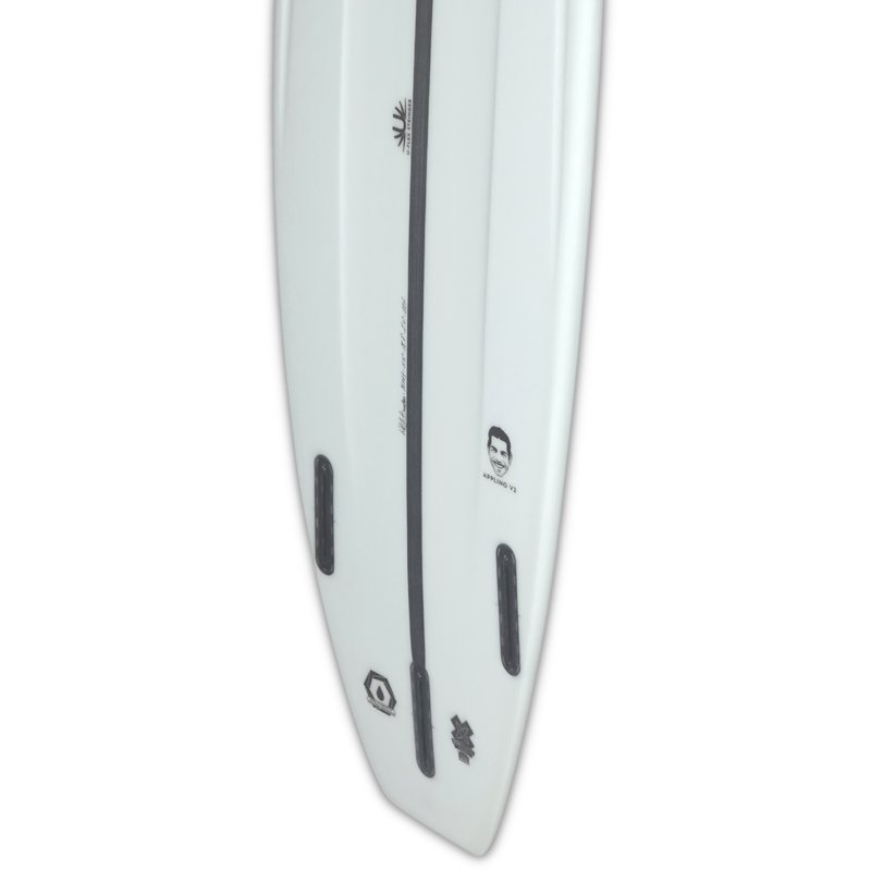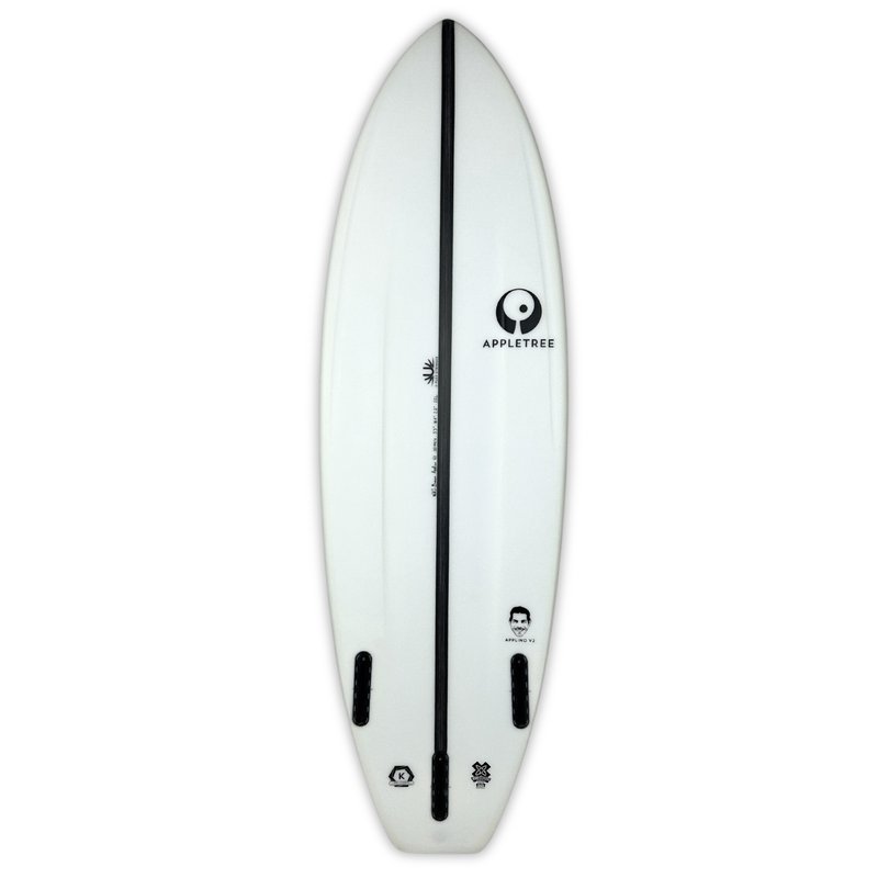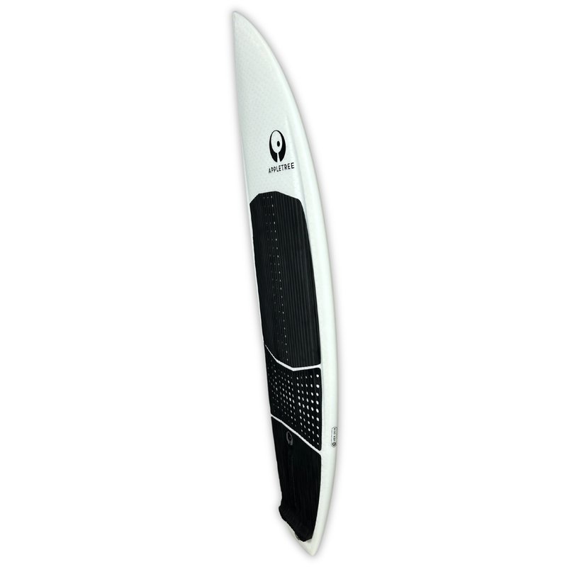 La gamme White Line regroupe les modèles best-sellers d’Appletree dans une construction standard éprouvée. Le cœur en mousse 50K closed cell exclusive est enveloppé d’un sandwich hex-skin : une couche structurelle de fibre de verre, un nid d’abeille flexible hex-skin, et une couche extérieure à 45°. Le bottom reste sans nid d’abeille pour préserver un flex maximal. Un renfort supplémentaire sous le pied avant complète l’ensemble.