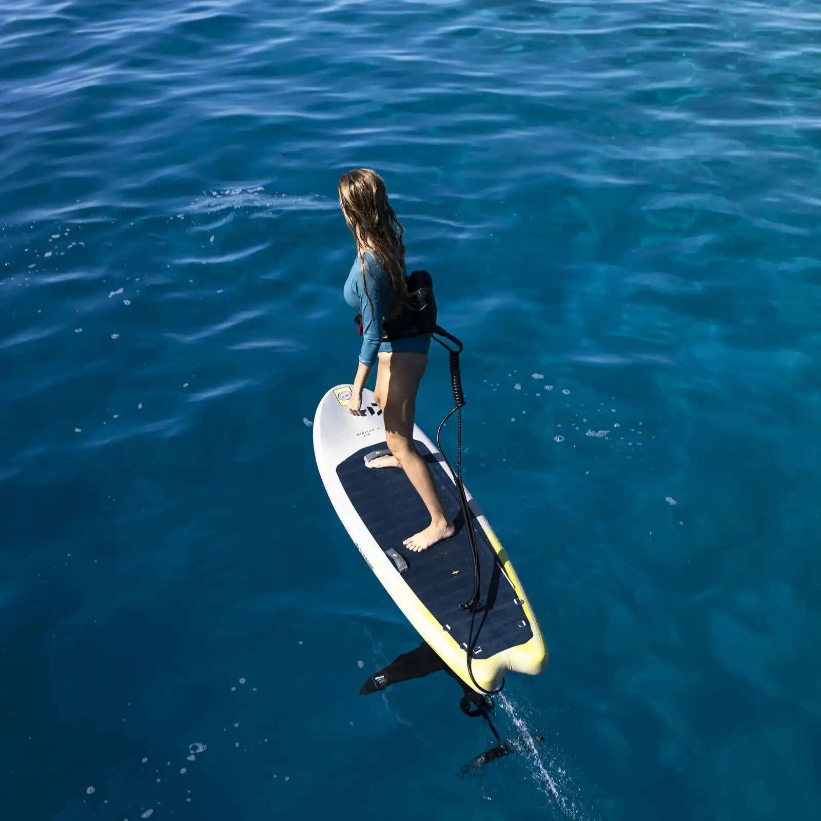 C'est une foilboard gonflable en Dropstitch double couche de 6'10" (115 L) avec boîtier foil carbone long (rails US), D-rings au tail, poignées néoprène et fishtail prolongé. Elle est pensée pour un usage eFoil léger et l’apprentissage.